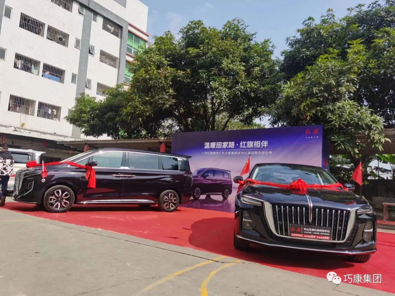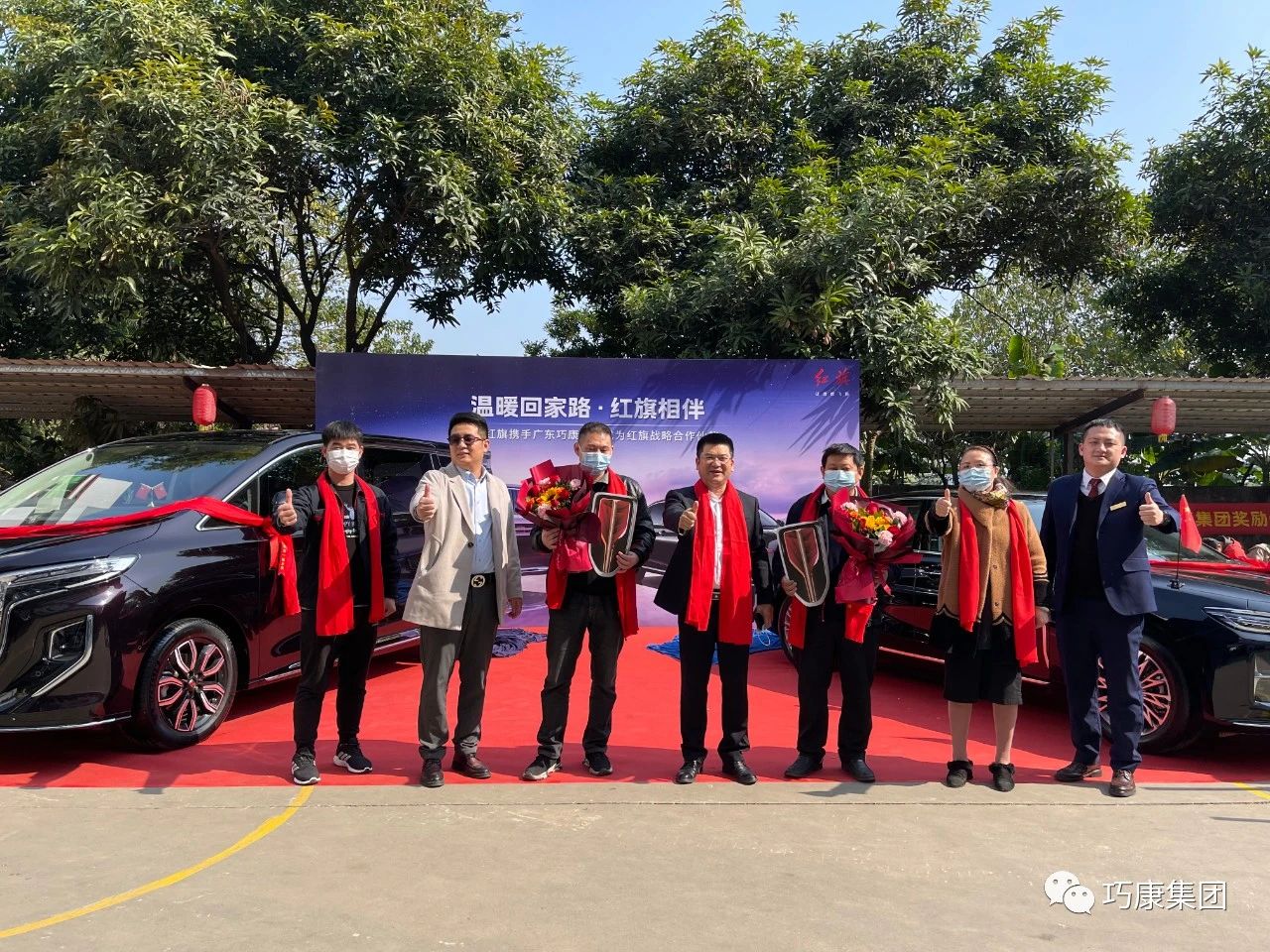 冬日阳光、丹桂飘香,满树娇艳的红花绚烂夺目。12月29日中午,一汽红旗携手广东巧康集团,为优秀管理人员进行赠车仪式。在温暖的冬日阳光下,广东巧康集团杨振巧董事长在厂区内现场为两位优秀管理人员颁发红旗H5轿车、红旗HQ9商务车奖励,共享发展成果。