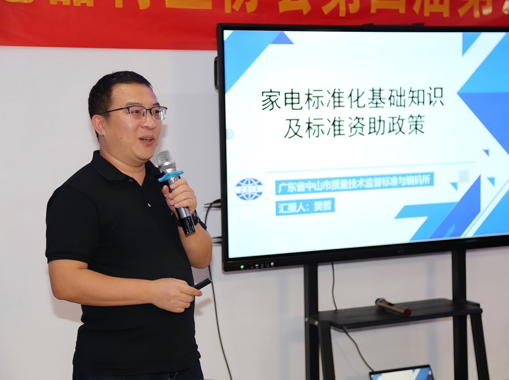 中山标码所标准化高级工程师樊哲为参会企业带来了标准化知识的精彩宣讲。他首先从标准定义、标准层级、标准约束力、标准编号、标准化对象、标准体系等方面为企业普及了智慧家电标准化基础知识,并就如何通过标准化手段提升企业竞争力提出了具体建议。